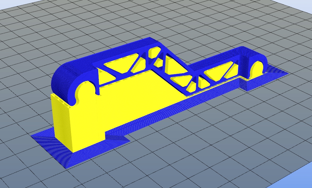 We are able to print angles up to 45 degrees without the need for support material, angles greater than 45 degrees require the addition of support material. The support material is calculated and added just before the model is printed and will be based on the specific model. Our live quote tool will estimate if support material may be required and adjust the price accordingly (as more material is required). The yellow parts in the picture below is the support material required to print the part if it is improperly oriented, the same part, if oriented correctly will print without support material at all.